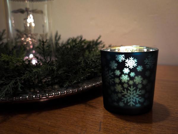 Somewhere along the line, I picked up three blue votive candle holders with snowflakes on them.
