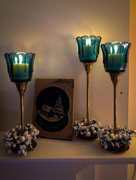 Now, I have a very small collection of blue candle holders and evergreens that come out after Christmas to adorn my living room. Just the living room. In the evenings, which are still quite dark and lengthy, the blue and green mixed with the flickering